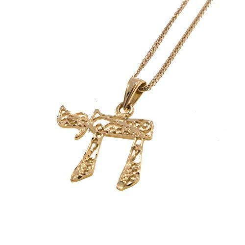 14K Yellow Gold Ornate Chai Life Hebrew Necklace, 14K Solid...
